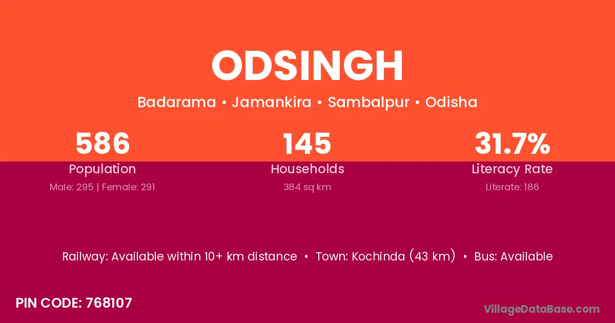 Kochinda (43 km) is the nearest town to Odsingh village for major economic activities and is located approximately 43 km away.