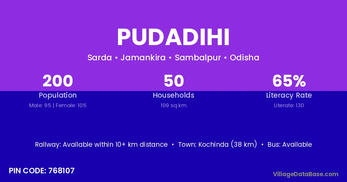 Kochinda (38 km) is the nearest town to Pudadihi village for major economic activities and is located approximately 38 km away.