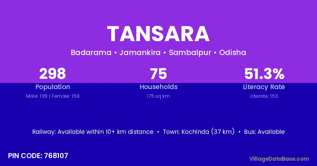 Kochinda (37 km) is the nearest town to Tansara village for major economic activities and is located approximately 37 km away.