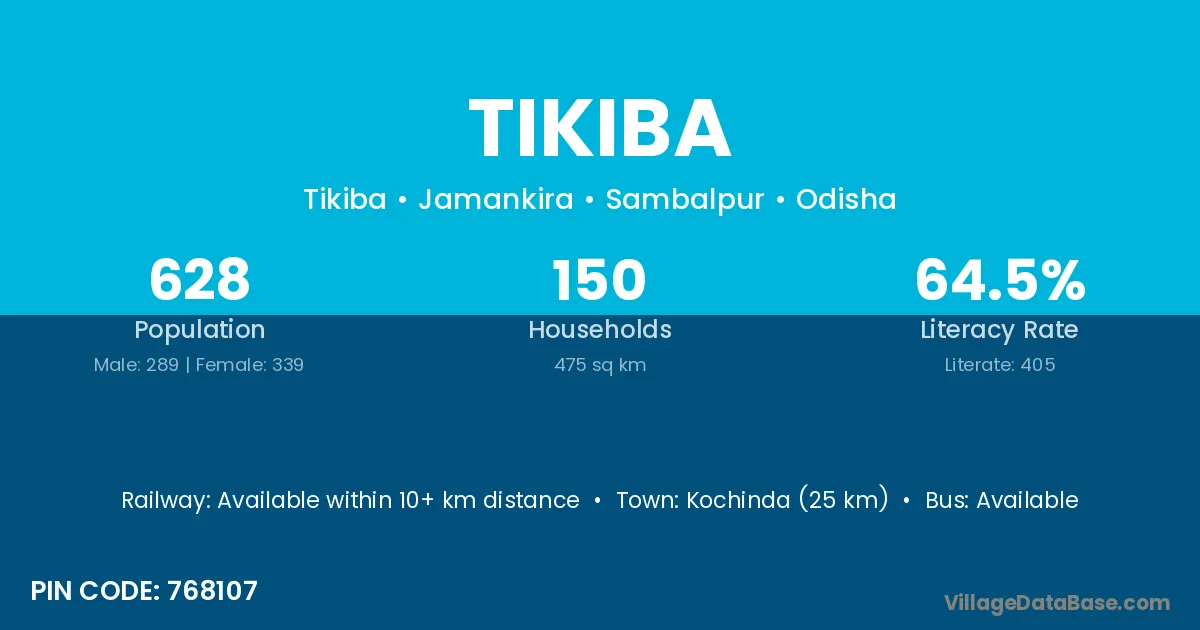 Kochinda (25 km) is the nearest town to Tikiba village for major economic activities and is located approximately 25 km away.