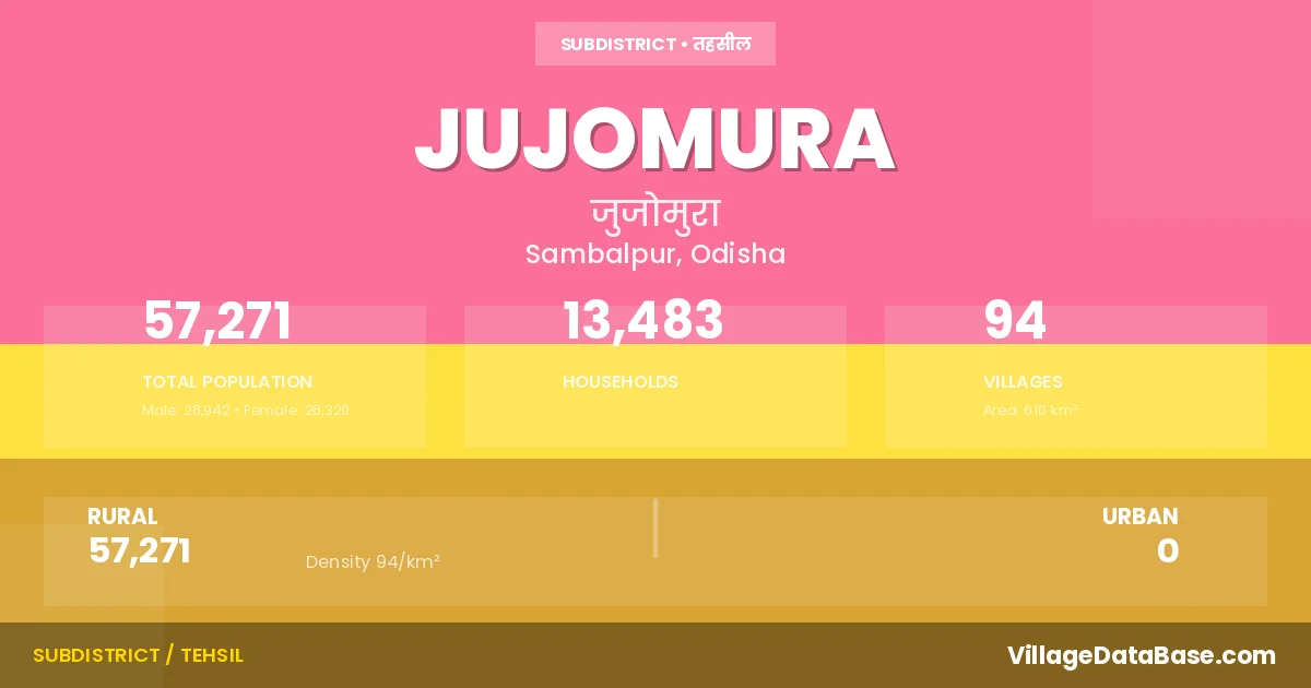 According to the 2011 census The total area of Jujomura Tehsil is 610 km², with a population of 57271 people. The population density is 94 inhabitants per square kilometre, and there are approximately 13483 houses in the sub district.