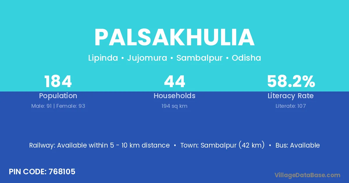 Palsakhulia village has a total population of 184 people, of which 91 are males and 93 are females.