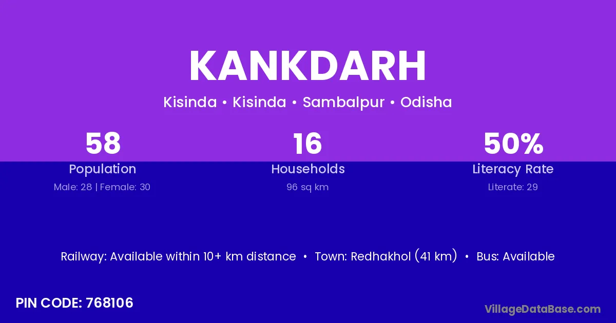 Redhakhol (41 km) is the nearest town to Kankdarh village for major economic activities and is located approximately 41 km away.