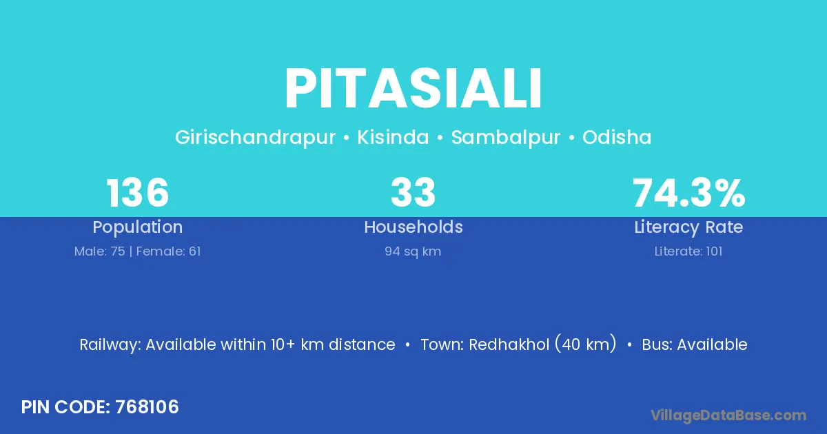Redhakhol (40 km) is the nearest town to Pitasiali village for major economic activities and is located approximately 40 km away.
