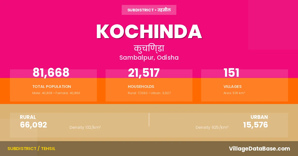 According to the 2011 census The total area of Kochinda Tehsil is 518 km², with a population of 81668 people. The population density is 158 inhabitants per square kilometre, and there are approximately 21517 houses in the sub district.