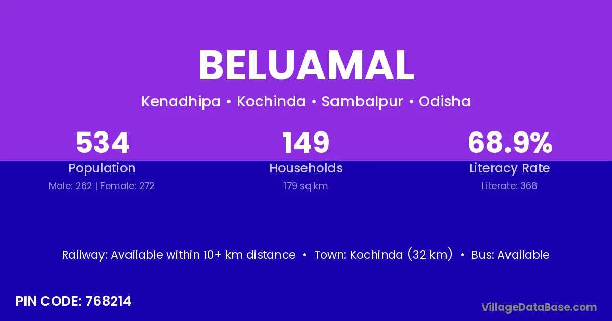 Kochinda (32 km) is the nearest town to Beluamal village for major economic activities and is located approximately 32 km away.