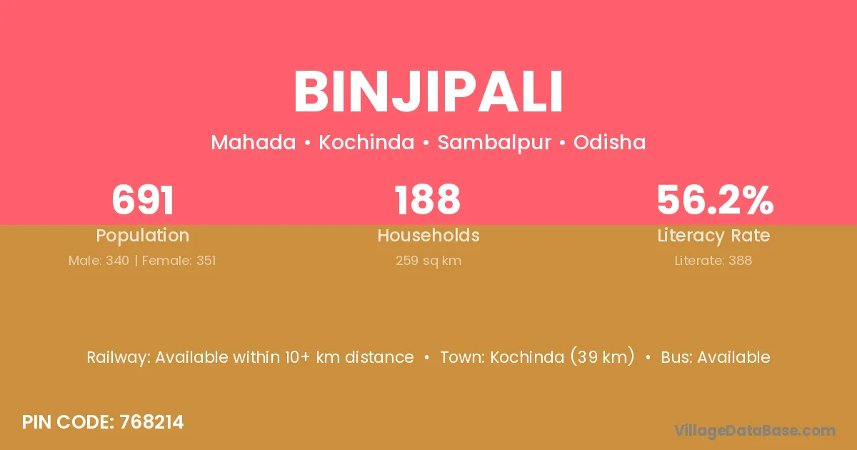 Kochinda (39 km) is the nearest town to Binjipali village for major economic activities and is located approximately 39 km away.