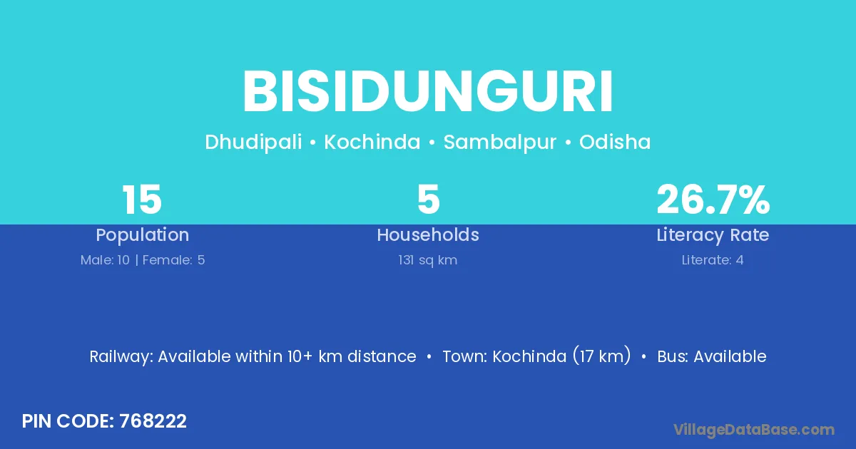 Kochinda (17 km) is the nearest town to Bisidunguri village for major economic activities and is located approximately 17 km away.