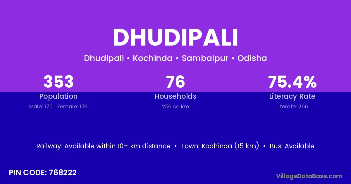 Kochinda (15 km) is the nearest town to Dhudipali village for major economic activities and is located approximately 15 km away.