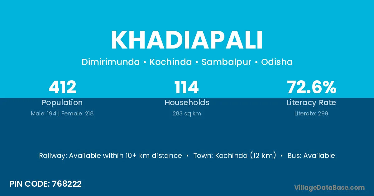 Khadiapali village has a total population of 412 people, of which 194 are males and 218 are females.
