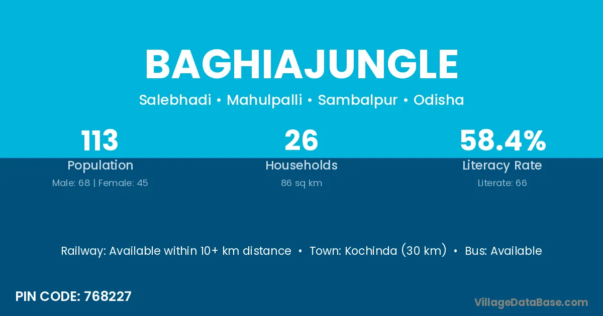 Baghiajungle village has a total population of 113 people, of which 68 are males and 45 are females.