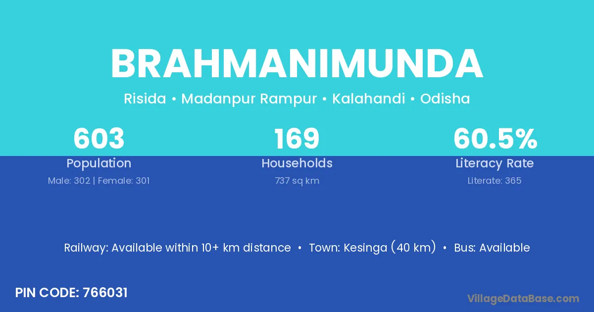 Kochinda (25 km) is the nearest town to Brahmanimunda village for major economic activities and is located approximately 25 km away.
