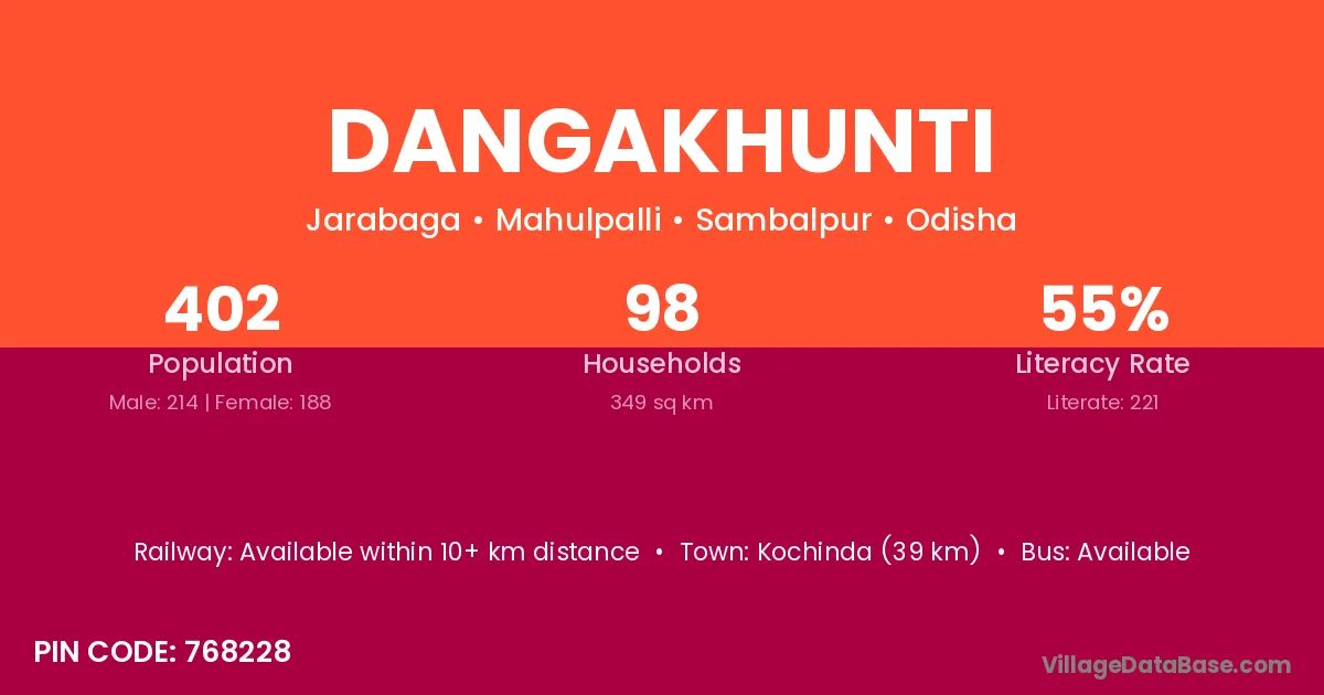 Kochinda (39 km) is the nearest town to Dangakhunti village for major economic activities and is located approximately 39 km away.