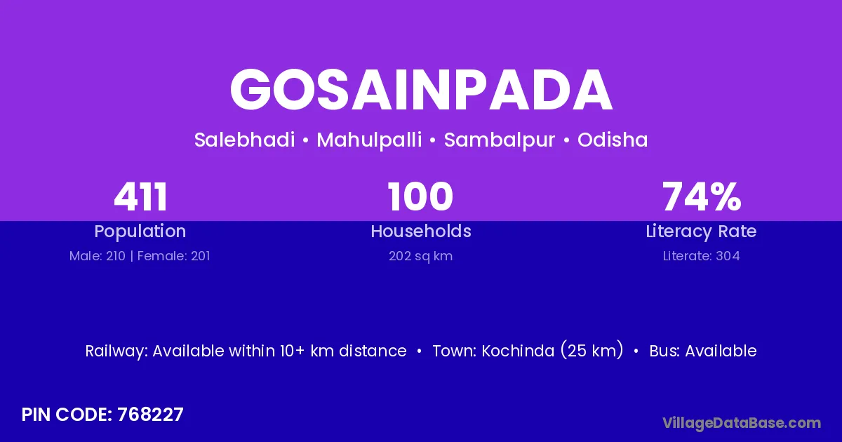 Kochinda (25 km) is the nearest town to Gosainpada village for major economic activities and is located approximately 25 km away.