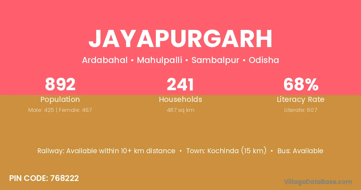 Jayapurgarh village has a total population of 892 people, of which 425 are males and 467 are females.