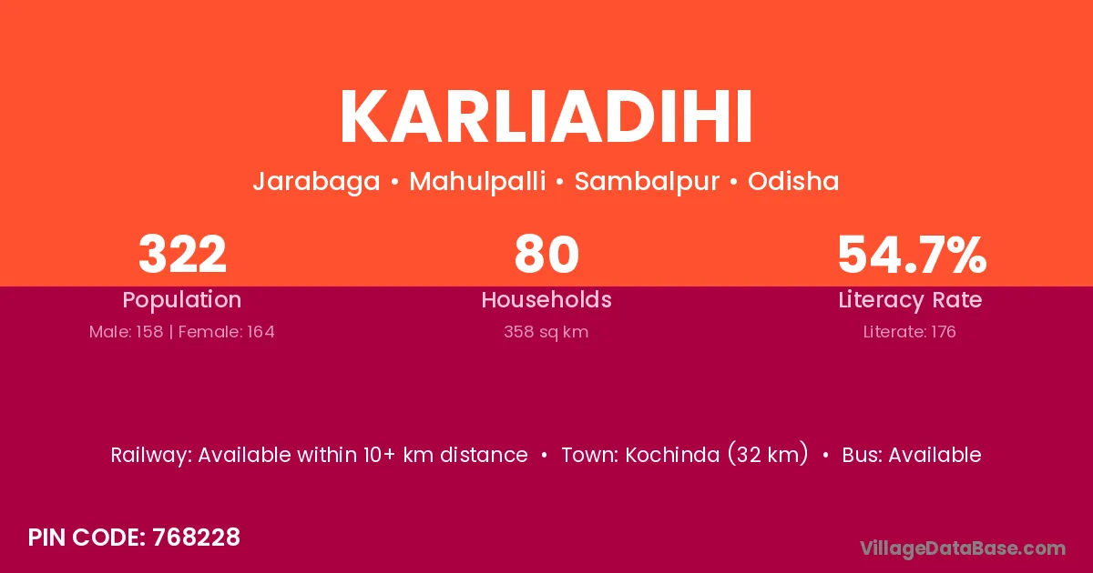 Kochinda (32 km) is the nearest town to Karliadihi village for major economic activities and is located approximately 32 km away.