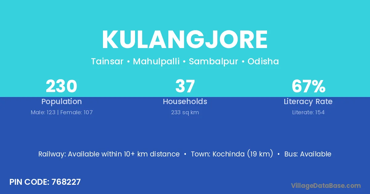 Kulangjore village has a total population of 230 people, of which 123 are males and 107 are females.