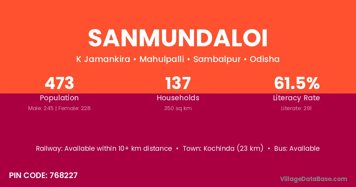 Kochinda (23 km) is the nearest town to Sanmundaloi village for major economic activities and is located approximately 23 km away.