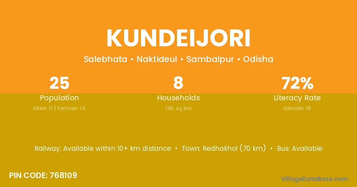 Redhakhol (70 km) is the nearest town to Kundeijori village for major economic activities and is located approximately 70 km away.