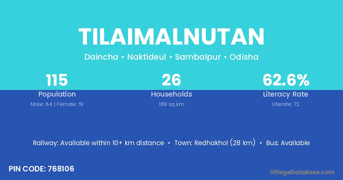 Redhakhol (28 km) is the nearest town to Tilaimalnutan village for major economic activities and is located approximately 28 km away.