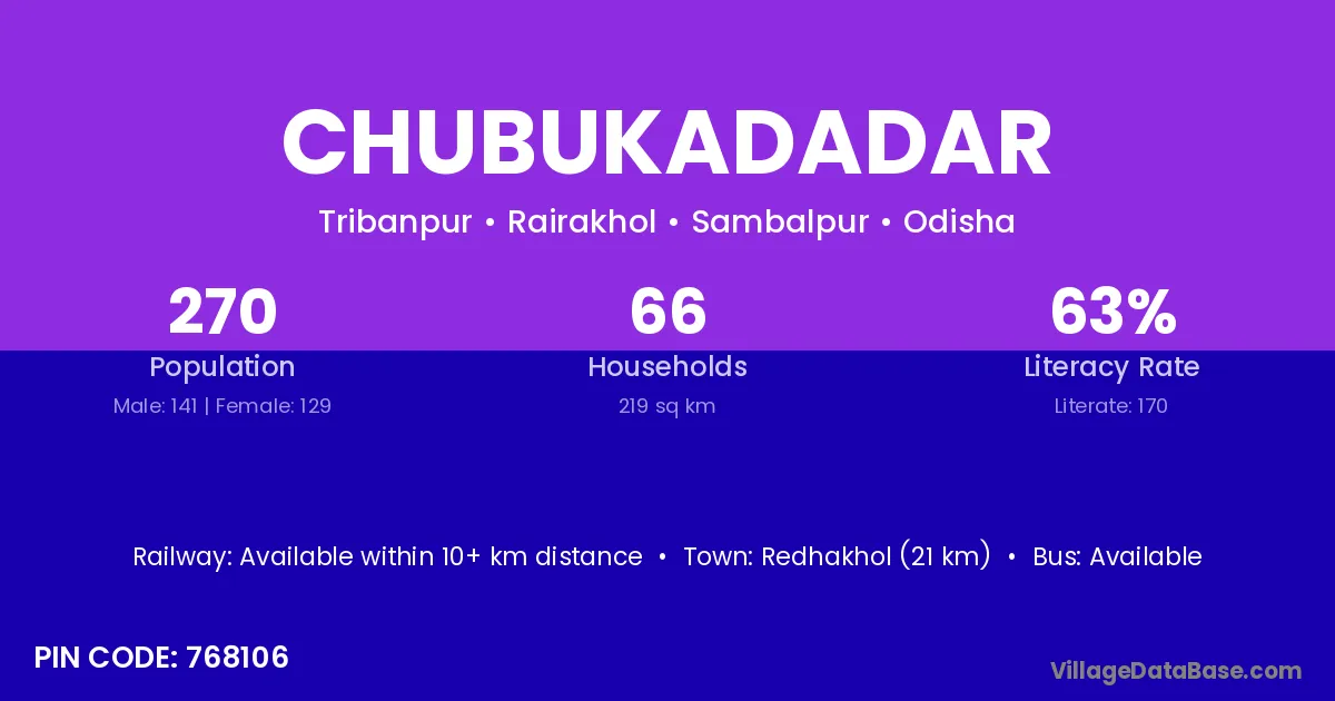 Redhakhol (21 km) is the nearest town to Chubukadadar village for major economic activities and is located approximately 21 km away.