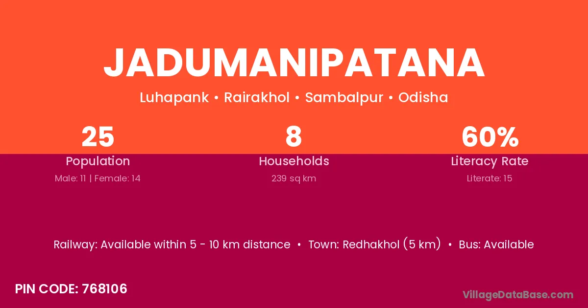 Redhakhol (5 km) is the nearest town to Jadumanipatana village for major economic activities and is located approximately 5 km away.