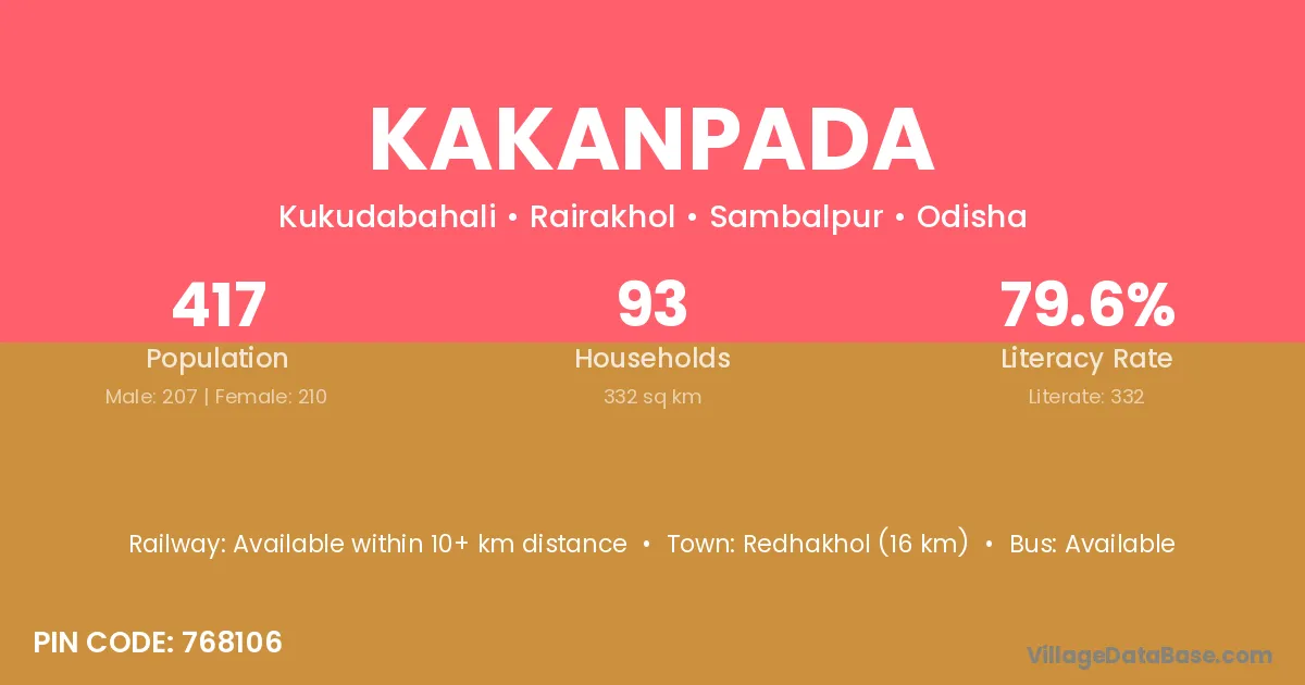 Redhakhol (16 km) is the nearest town to Kakanpada village for major economic activities and is located approximately 16 km away.