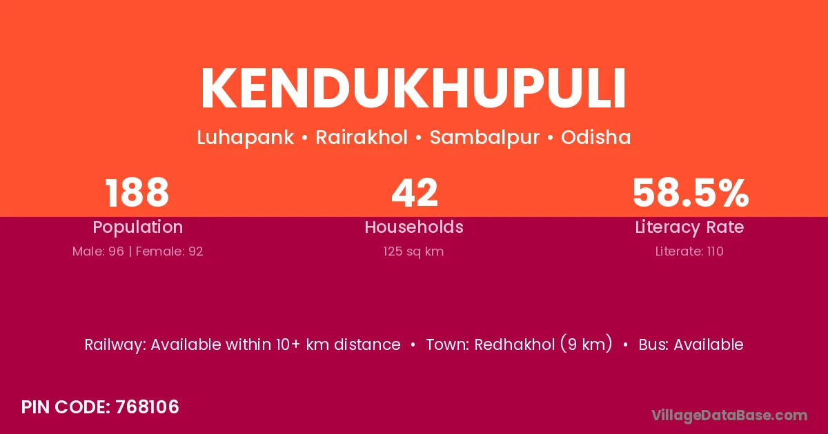 Redhakhol (9 km) is the nearest town to Kendukhupuli village for major economic activities and is located approximately 9 km away.