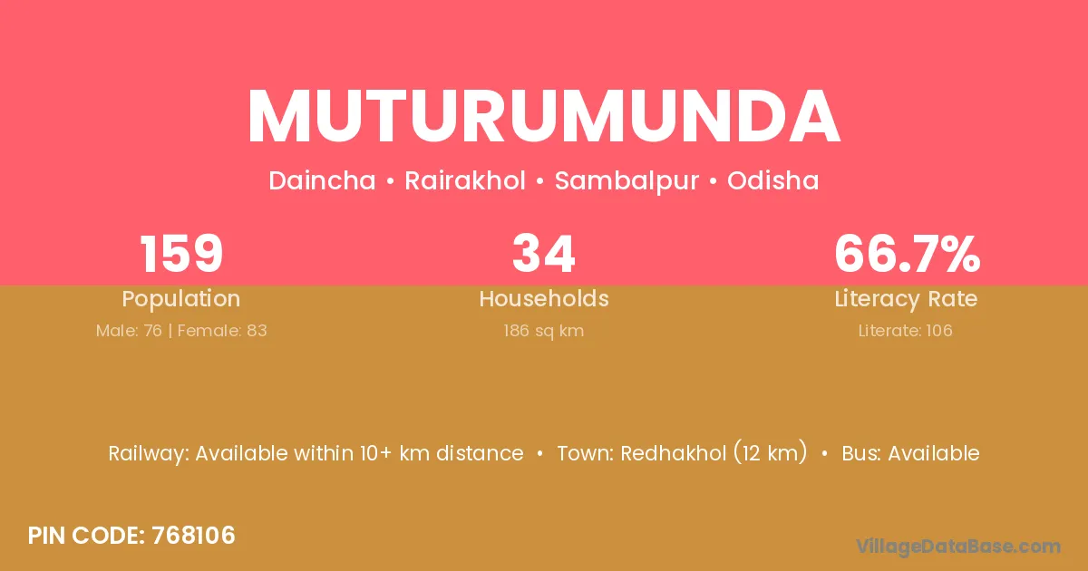 Redhakhol (12 km) is the nearest town to Muturumunda village for major economic activities and is located approximately 12 km away.