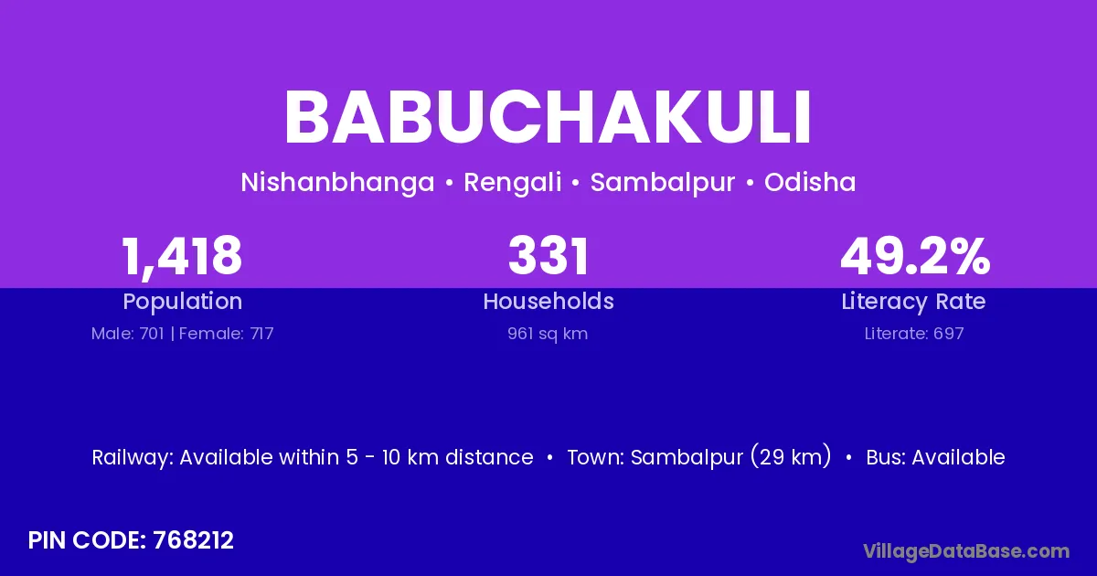 Sambalpur (29 km) is the nearest town to Babuchakuli village for major economic activities and is located approximately 29 km away.