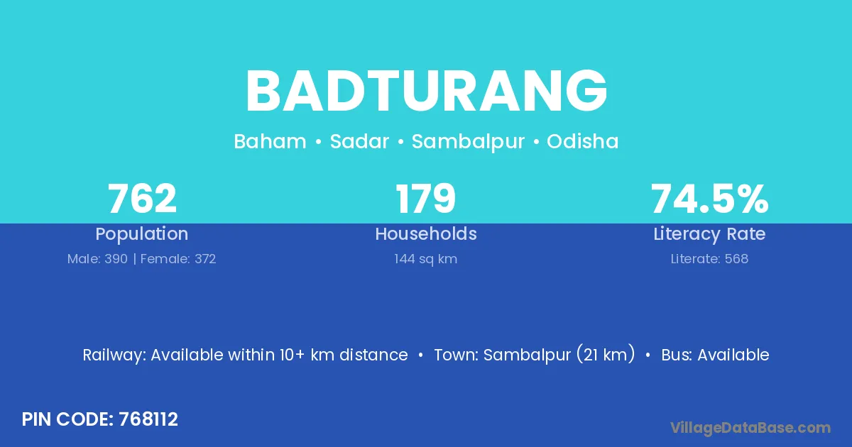 Sambalpur (21 km) is the nearest town to Badturang village for major economic activities and is located approximately 21 km away.