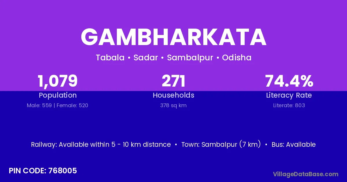 Sambalpur (7 km) is the nearest town to Gambharkata village for major economic activities and is located approximately 7 km away.