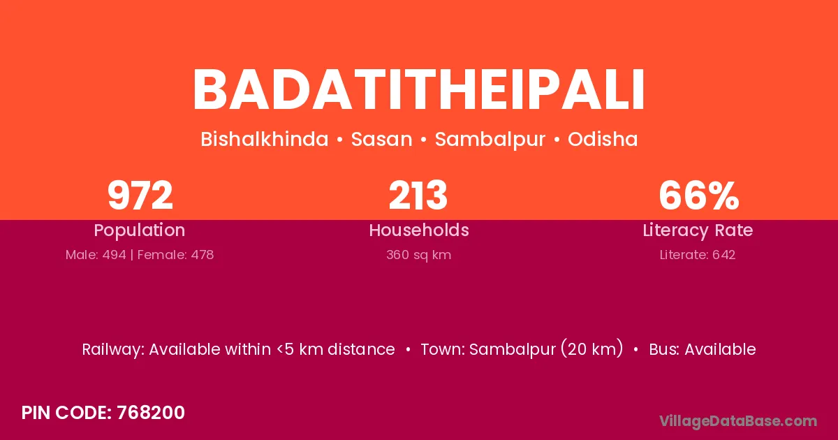 Sambalpur (20 km) is the nearest town to Badatitheipali village for major economic activities and is located approximately 20 km away.