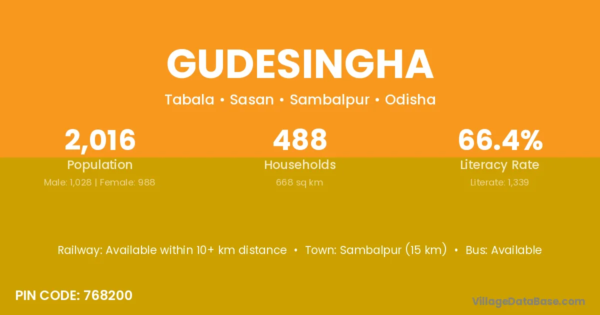 Gudesingha village has a total population of 2,016 people, of which 1,028 are males and 988 are females.