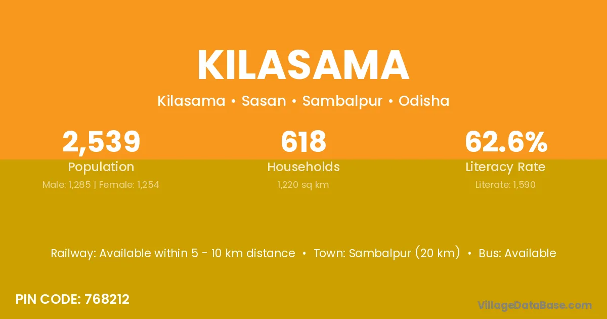 Sambalpur (20 km) is the nearest town to Kilasama village for major economic activities and is located approximately 20 km away.