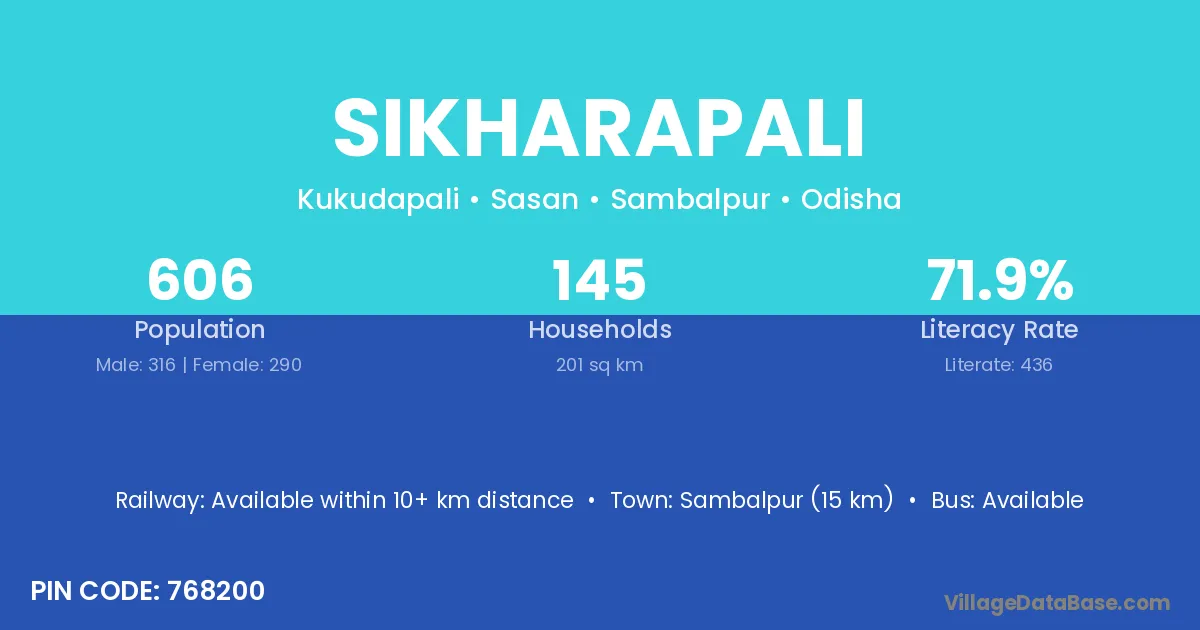 Sikharapali village has a total population of 606 people, of which 316 are males and 290 are females.