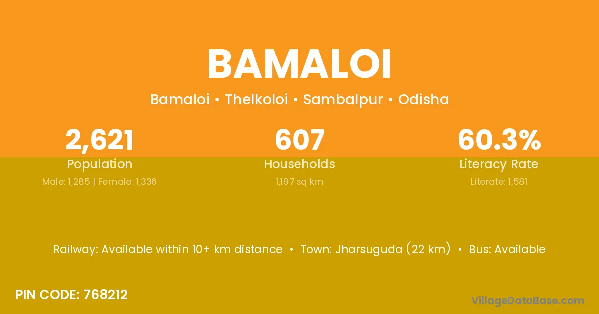 Jharsuguda (22 km) is the nearest town to Bamaloi village for major economic activities and is located approximately 22 km away.