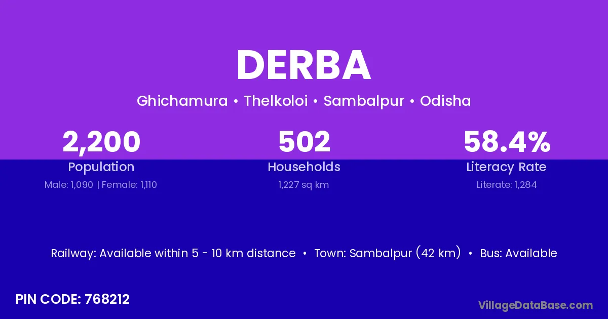 Sambalpur (42 km) is the nearest town to Derba village for major economic activities and is located approximately 42 km away.