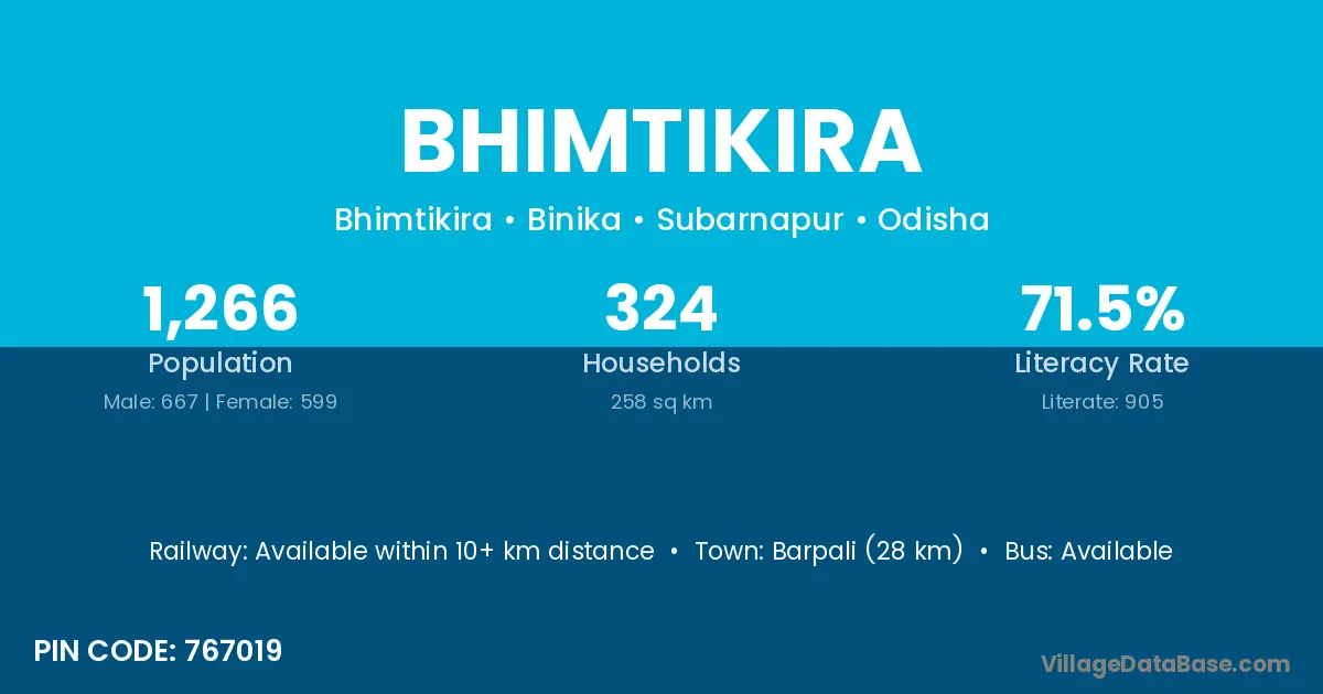 Barpali (28 km) is the nearest town to Bhimtikira village for major economic activities and is located approximately 28 km away.