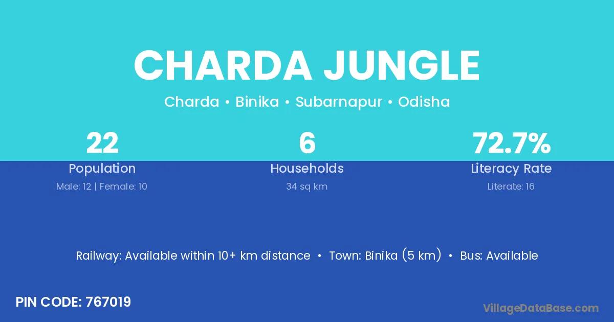 Binika (5 km) is the nearest town to Charda Jungle village for major economic activities and is located approximately 5 km away.