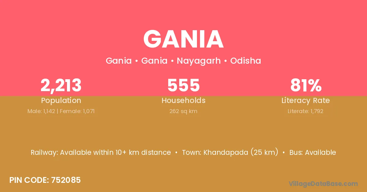 Barpali (25 km) is the nearest town to Gania village for major economic activities and is located approximately 25 km away.