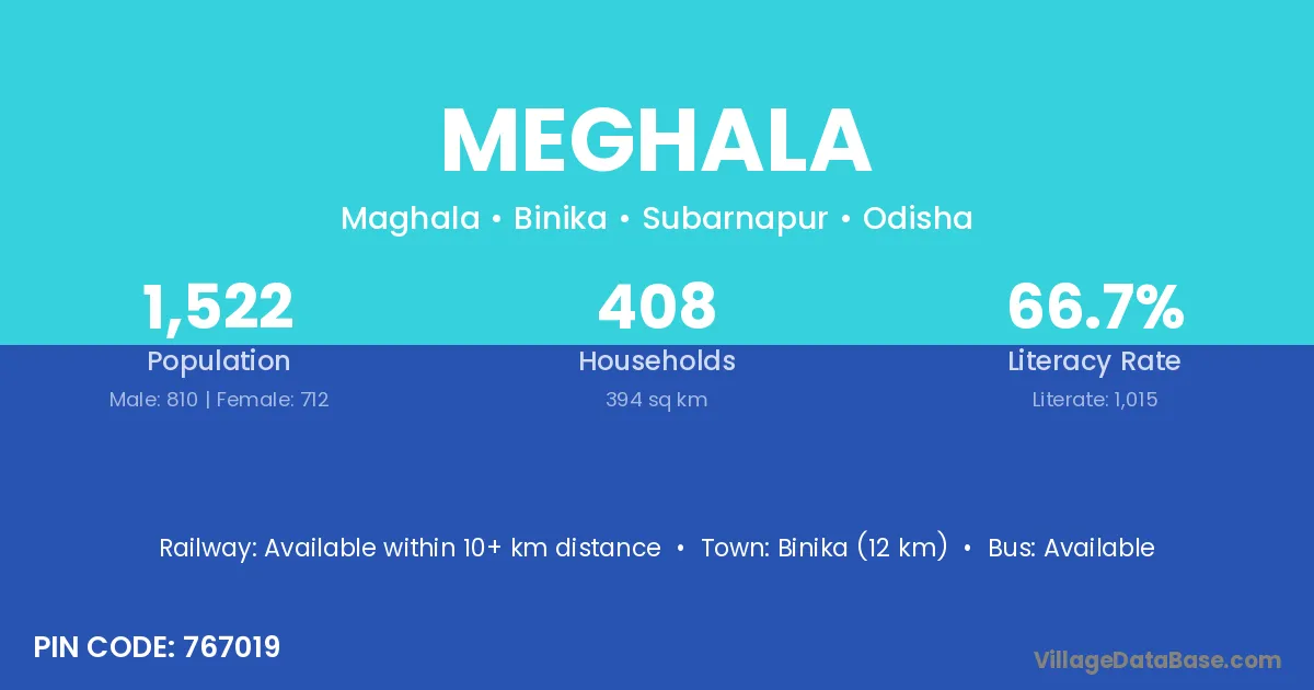 Binika (12 km) is the nearest town to Meghala village for major economic activities and is located approximately 12 km away.