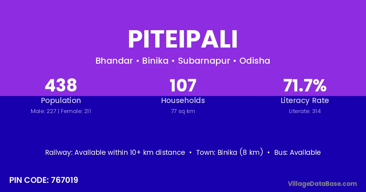 Binika (8 km) is the nearest town to Piteipali village for major economic activities and is located approximately 8 km away.