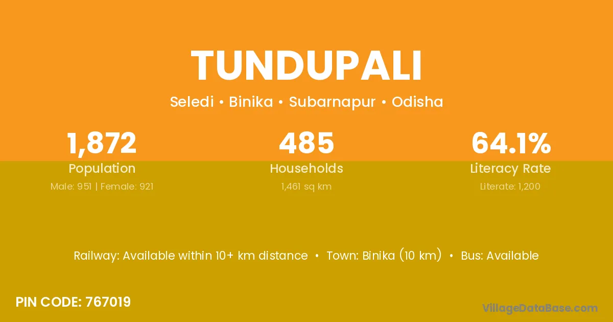 Tundupali village has a total population of 1,872 people, of which 951 are males and 921 are females.