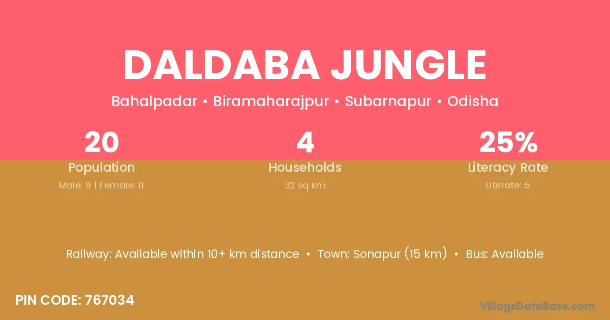 Daldaba Jungle village has a total population of 20 people, of which 9 are males and 11 are females.