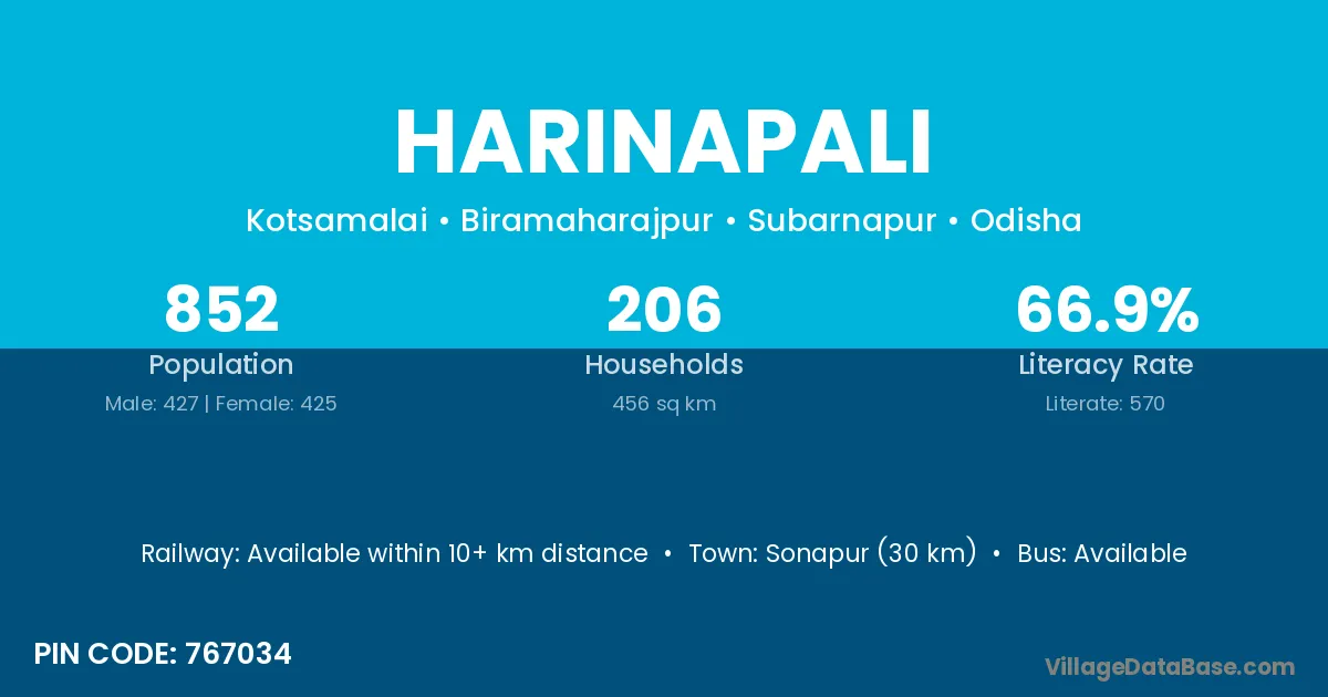 Harinapali village has a total population of 852 people, of which 427 are males and 425 are females.