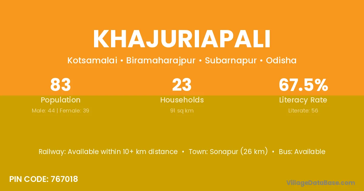Khajuriapali village has a total population of 83 people, of which 44 are males and 39 are females.