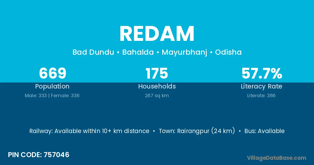 The literacy rate of Redam village is 71.34%. Male literacy stands at 81.44% and female literacy at 59.86%.