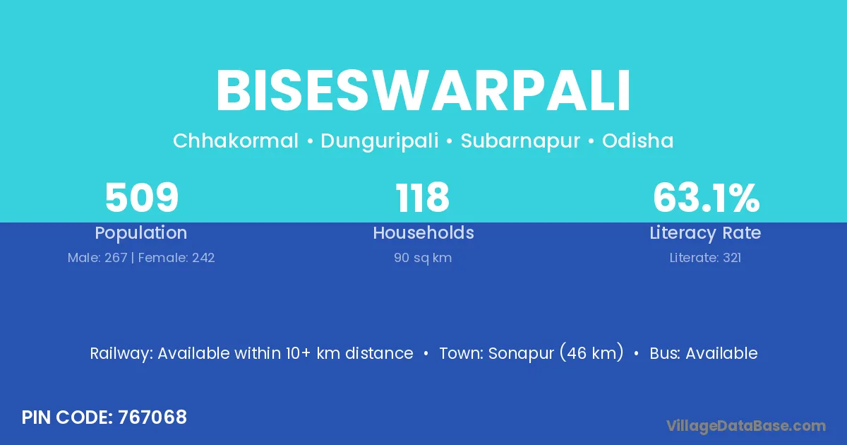 Biseswarpali village has a total population of 509 people, of which 267 are males and 242 are females.