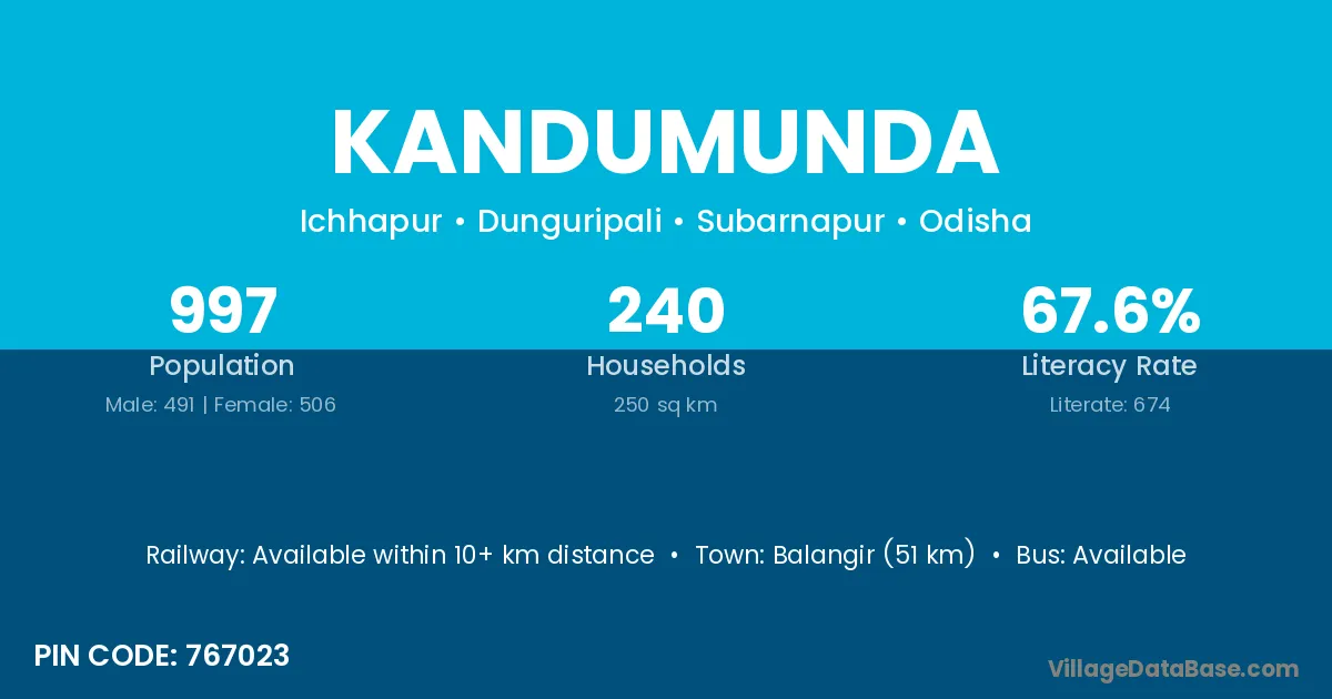 Kandumunda village has a total population of 997 people, of which 491 are males and 506 are females.